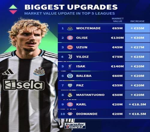 最新一期五大联赛球员身价涨幅榜发布伊萨克这表现能涨2000万