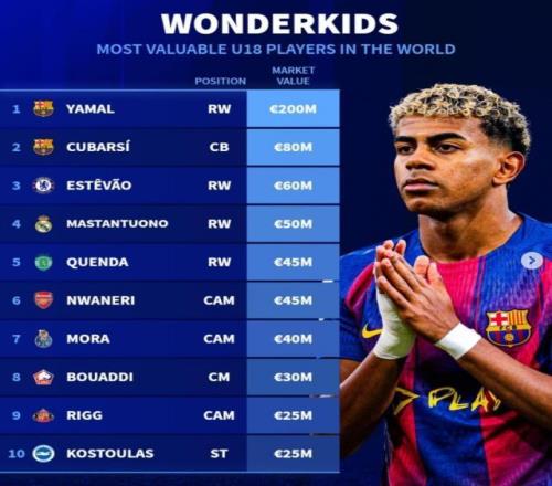 德转列U18身价榜:亚马尔、库巴西前二