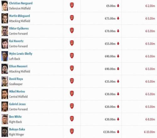 阿森纳球员身价变动:萨利巴上涨1000万欧,萨卡下跌1000万欧