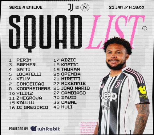 尤文图斯官方公布了意甲第22轮主场对阵那不勒斯的比赛大名单,伊尔迪兹领衔,鲁希、平索利奥缺席,17岁门将胡利入选。