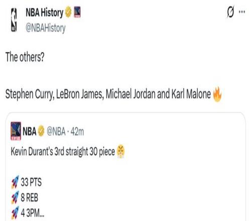 这也让杜兰特成为历史第5位在37岁后还能连续3场30+的球员,成功比肩乔丹、詹姆斯、库里和卡尔-马龙。