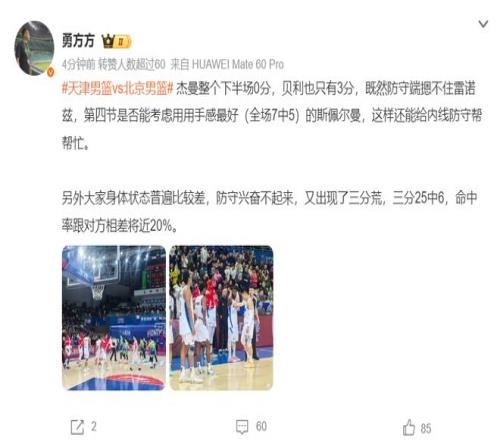 媒体人周赫对北京这场失利非常不满,他认为末节该弃用的是8中1的杰曼而非斯佩尔曼,因为末节天津是用雷诺兹,北京这边应该让斯佩尔曼上去限制他的发挥。