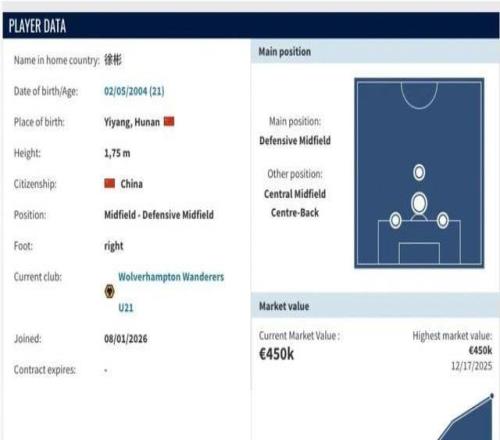 身价45万欧元!U23国足队长、青岛西海岸球员徐彬已正式加盟英超狼队 -